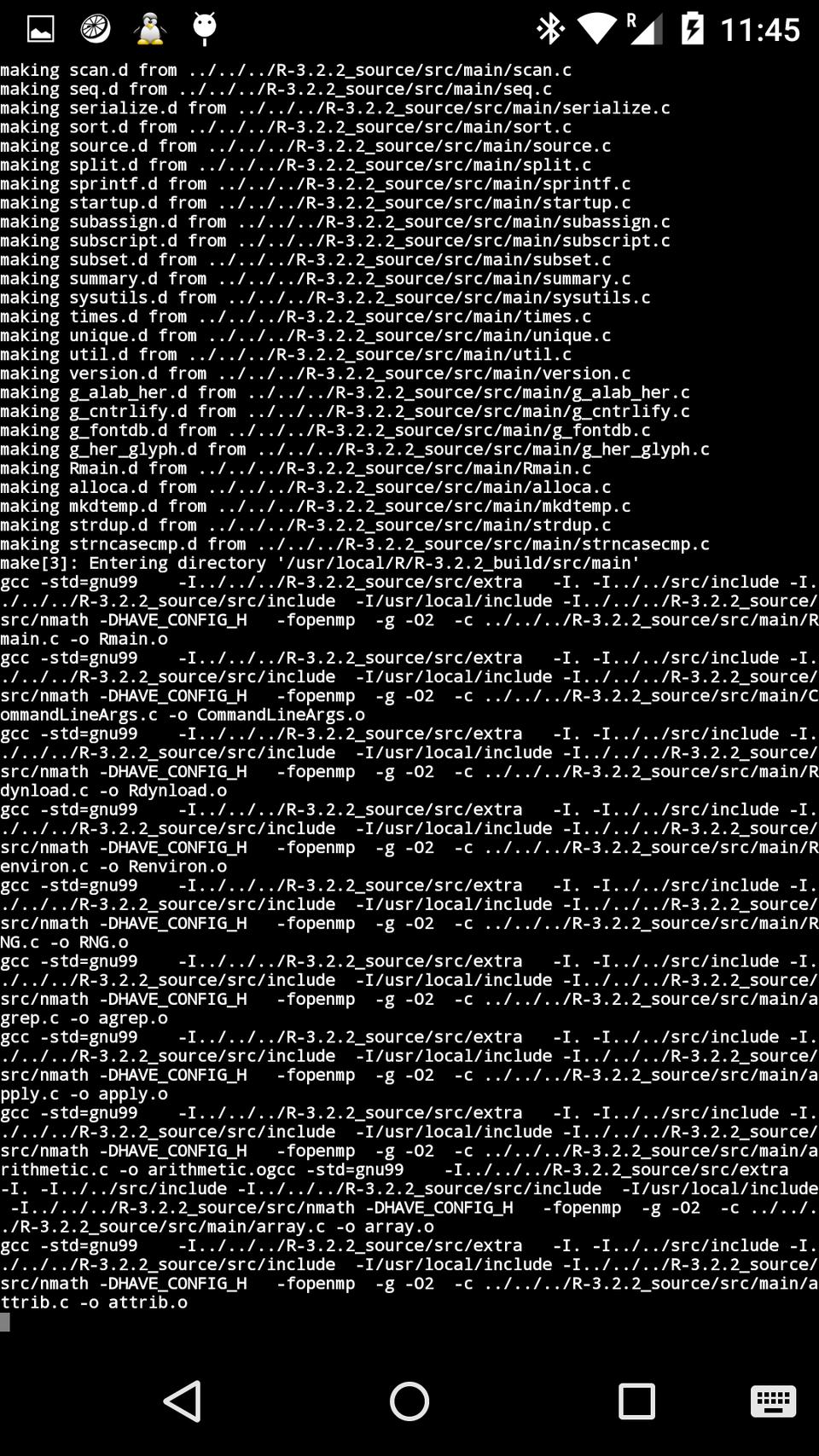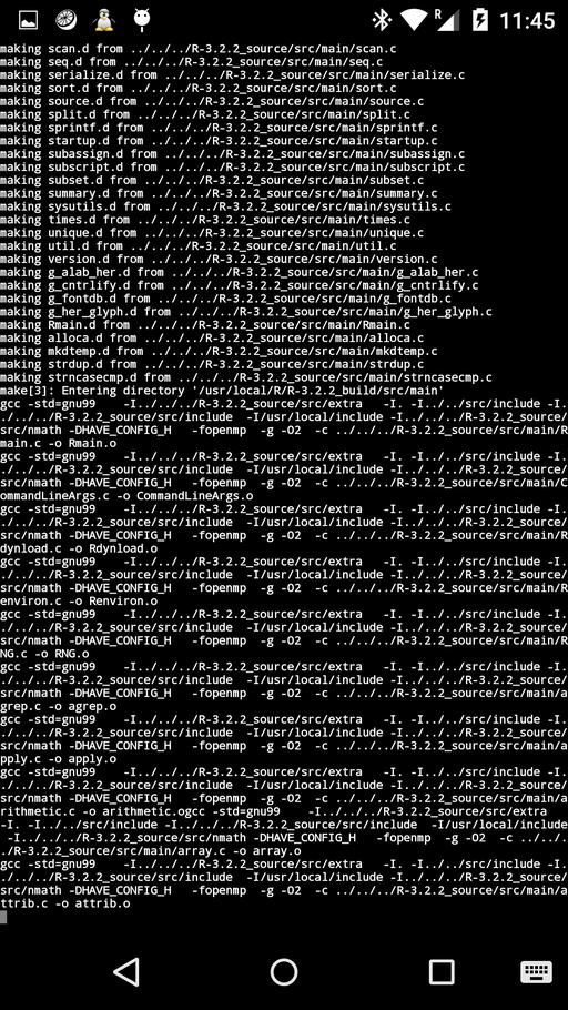 After this installation, restart Linux Deploy (otherwise R is not found from within JuiceSSH or VNC Viewer). Figure 3 shows a screenshot taken during the R installation process (during make), and Figure 4 shows R running over SSH via JuiceSSH.