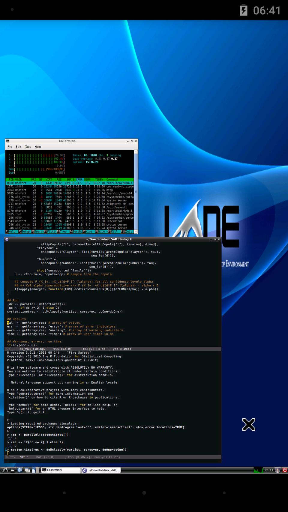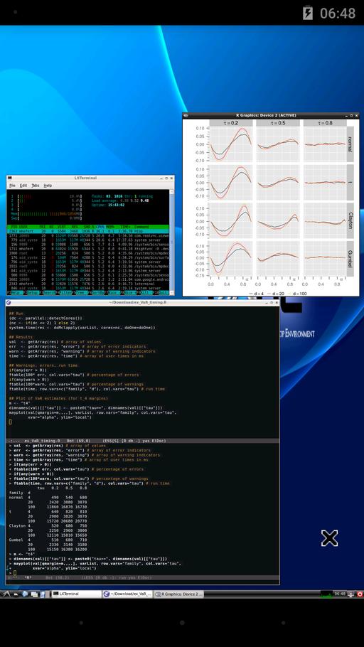 Figure 7 shows the example while being run on two of the four cores of the smartphone (see the htop output) and the graphical output of the result (Figure 8). This example was run exactly as on the laptop, by opening Emacs and executing the code line by line as one would do with most R scripts; in particular, we did not have to change our workflow to run this code on Android as we essentially run it on a Linux OS.