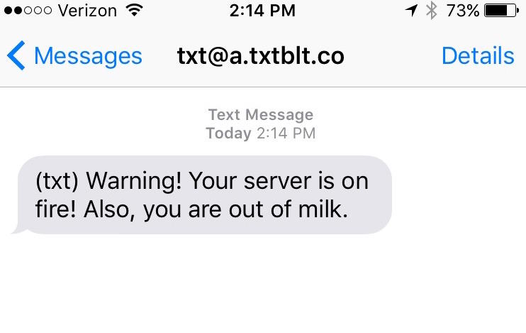 curl -X POST http://textbelt.com/text -d number=5551234567 -d ↪'message=Warning! Your server is on fire! Also, ↪you are out of milk.'