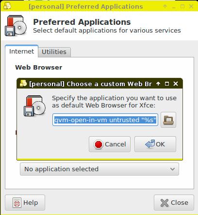 The default URL handler is a setting that you have to make in each appVM. The way I set it is to go to the shortcuts editor for that appVM (by clicking the “add more shortcuts...” option in that appVM's desktop menu) and adding the Preferred Applications program to that appVM's shortcuts. This is the same program that you use on a regular desktop to choose Firefox or Chrome as your default web browser. Once I've added the shortcut, I then launch the program, and in the section where I can set the web browser (Figure 1), I choose Other so I can type in my own custom command, and in that field, I type: