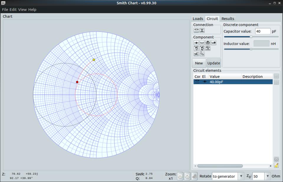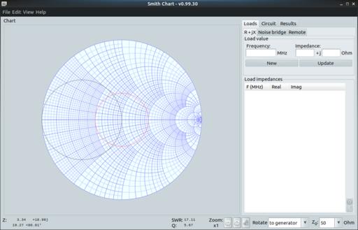 When it first starts, you will see a blank Smith chart, ready for use. On the right-hand side of the main window is a set of tabbed panels where you can enter the details of the electrical problem you are working on. This section is broken into loads that you can apply to the system, a circuit tab where you can define discrete circuit elements that are part of the problem, and a results tab where you can find a running log of the calculations being made.