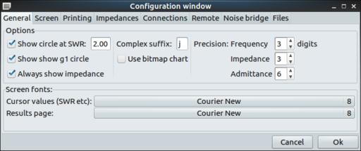 Clicking on the Edit→Preferences menu item will open a new window where you can set several preferences for how linsmith can work. Several tabs covering several sections of options are available. The first tab, General, sets the most basic of parameters. The screen tab lets you set the image used as the background of the Smith chart, along with what colors you want to use for the various elements. The printing tab lets you set the paper size and margins, along with the colors to use for each of the parts of your Smith chart.