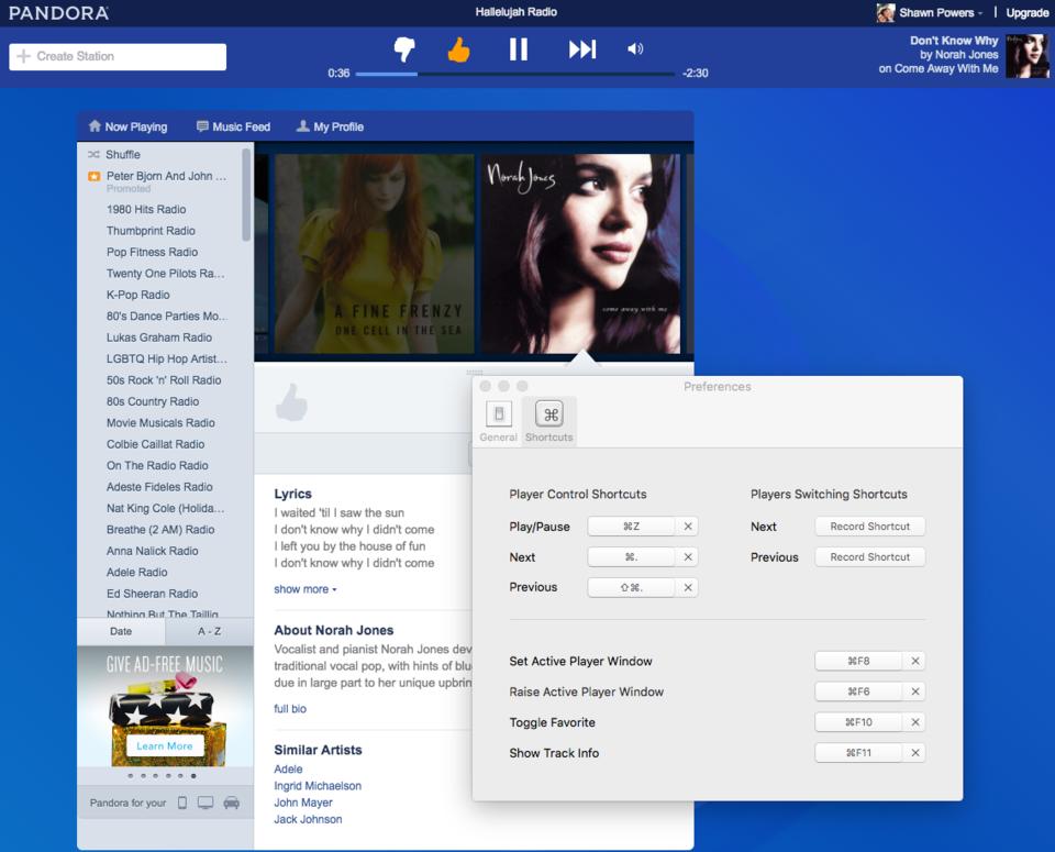 One of the frustrating things about using the web-based version of Pandora is that getting back to the proper tab can be frustrating. Thanks to an oddly named open-source tool for OS X, when I'm on a Mac, I can map keyboard shortcuts to the web player even if it's in the background.
