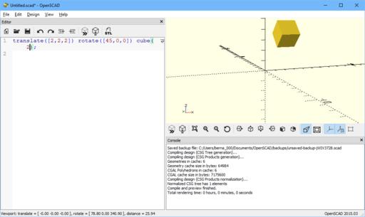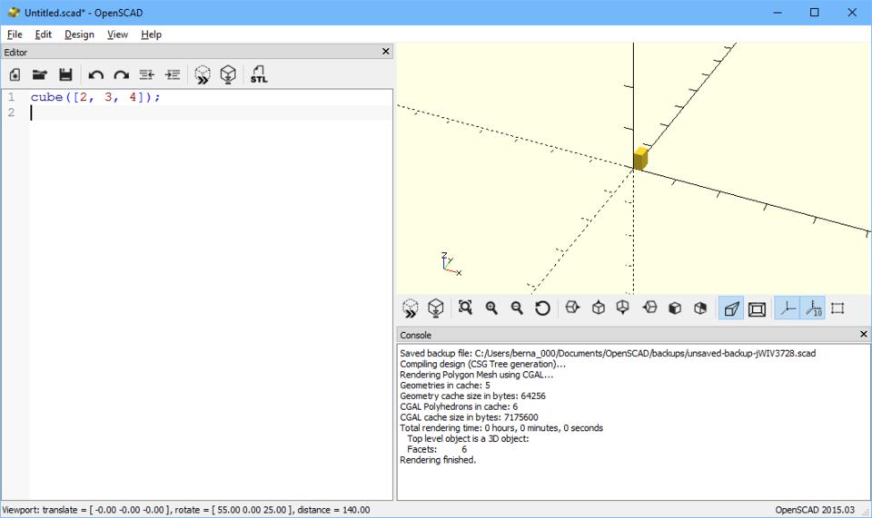When you are ready to start a new project, you can click on the menu item File→New or press Ctrl-N. This will pop up a new window with an empty editor. Unlike many other CAD systems, OpenSCAD doesn't include a toolbox of objects that you can click and drag to build up your object. Instead, you need to type in the specifications for each of the elements for your design. As a simple example, you could add a cube with dimensions 2x3x4 by typing:
