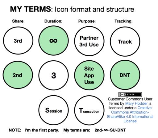 To get this rolling, we now have Customer Commons (customercommons.org), which will do for personal terms what Creative Commons (https://creativecommons.org) does for copyright. Right now Customer Commons is co-baking standard terms with the Consent & Information Sharing Working Group at Kantara (https://kantarainitiative.org/confluence/display/infosharing/User+Submitted+Terms+project+overview). For example, see Figure 3 (customercommons.org/2016/01/04/terms-what-are-they-and-why-should-you-care).