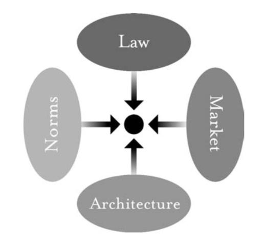 Below it he explains, “At the center of this picture is a regulated dot: the individual or group that is the target of regulation, or the holder of a right....The ovals represent four ways in which the individual or group might be regulated—either constrained or, alternatively, enabled.”