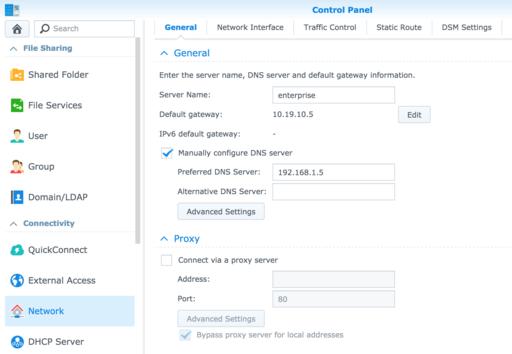 I also can't run the really amazing reverse proxy server on Synology. The setup is easy, and the configuration is very intuitive, but my VPN/no-gateway setup means that the reverse proxy doesn't work outside my network. Even if I forward a port to the NAS from my router, it tries to send responses out the VPN connection and fails. Reverse proxies are easy enough to configure on any other machine in my network, so it's not a huge loss, but it's worth noting that it's something my crazy VPN system breaks.