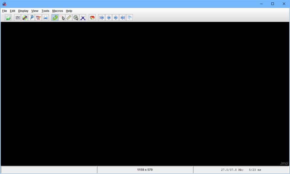 When you first start Jmol, you'll see a blank screen, ready for input. Across the top is a series of icons allowing for easy access to the key functions available within Jmol. If you already have data files to analyze, you can use them. Otherwise, you may need some sample files in order to play with the functionality available.