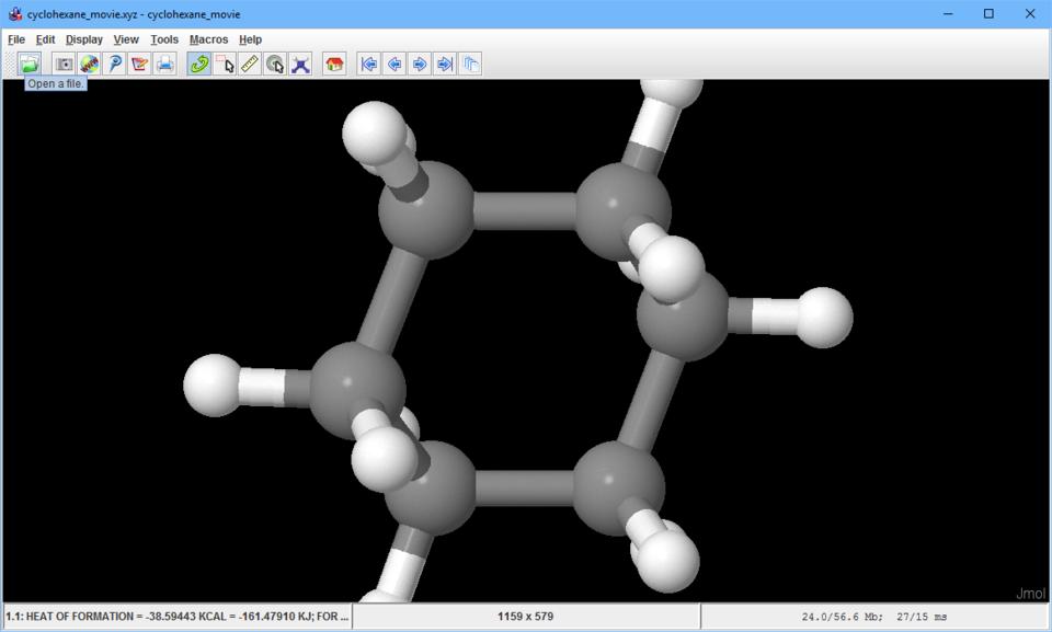 Jmol also can display animations of events, along with static images. The animations subdirectory contains several examples that you can play with. When you load it up, you start with a static image of the molecule as before.