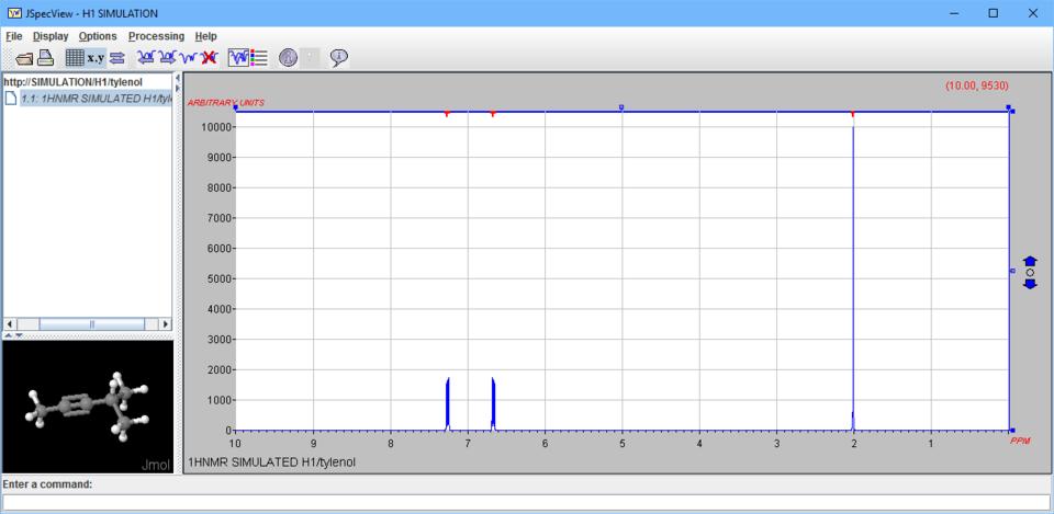 Several more analysis tools are available. Clicking the Tools→Spectra→JSpecView menu item pops up a new window. Under the File menu item, you'll find options to add extra files, or do H1 or C13 simulations. You can select Tools→Measurements to measure the distance between atoms within your molecule, and you can set the units used for those measurements with the Tools→Distance Units menu item. You actually can edit the molecule after it is loaded too.