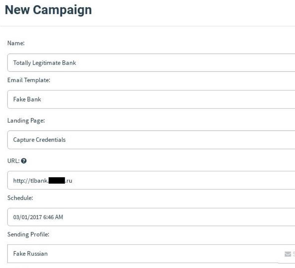 Click the Campaigns link and open a new campaign. Set the options to match Figure 10. The URL I've entered is the FQDN of the host (tlbank) created earlier. If your DNS server has records for the zone and host, a valid URL will show in the user's browser. This is important, as you don't want any savvy users familiar with your IP scheme to catch on just by looking at the URL. Click Launch Campaign when ready. When you monitor this campaign, you will see the “Event: Clicked Link”, and if the user entered data into the fake site, you will see a second red dot with the “Event: Submitted Data” indicating a user submitted information in the form.