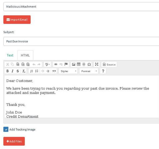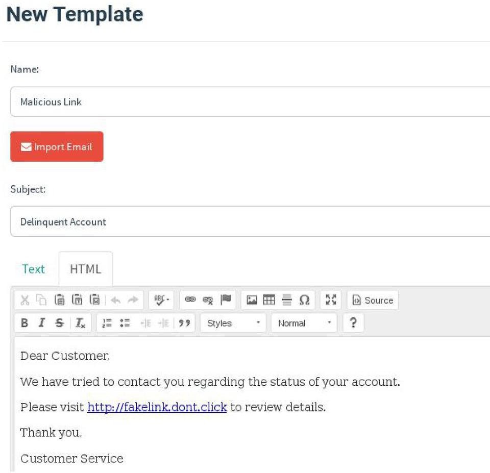 If you choose to use a custom email tailored after a real-world phishing message, do not directly use anything from the web. You can scrub those messages with a fine-tooth comb, but the last thing you want is to miss something that inadvertently brings malware onto your network. My advice is to transcribe any examples you want to use. Never copy and paste. Transcribing is the only sure-fire way to avoid accidentally using any malicious code in your testing. Thoroughly scan any images you want to download and use. Be cautious in using images that are not your own.