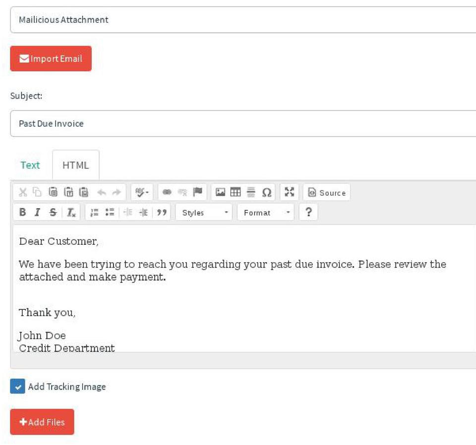 Back on the Gophish server, create a new Email Template named “Malicious Attachment”, and use the document file you created as an attachment by clicking on the Add Files button. See Figure 11 for the wording of the template.