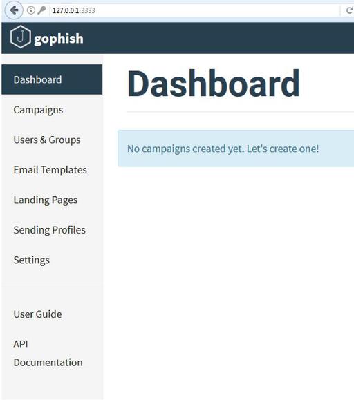 To start the program, run gophish from a terminal window. This launches a script that starts the various components of the Gophish program. Once the script has completed, you are notified that an admin page is running on http://127.0.0.1:3333 (Figure 1). Open a browser on the local machine and log in with the default credentials of “admin/gophish”. Upon logging in, you are presented with a minimalist interface from which you can start working (Figure 2).