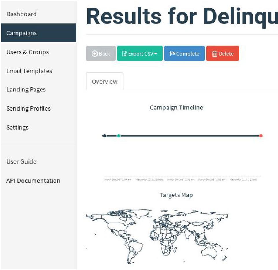 With the campaign underway, you can view the results on either the Dashboard or Campaigns link (Figure 8). Leave your campaigns in place for as long as you feel necessary. A few days normally should suffice, as users have short memories. When you are ready, you can complete your campaign by using the Complete button. You should see a Timeline displaying when the emails were sent and (if successful) when the link was clicked. If you scroll down, you'll see the results listed by the users in your group. Any success represents legitimate opportunities for a user to be lured to a malicious site using a phishing message.