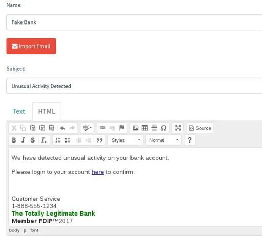 It is not necessarily a bad idea to create a template that resembles a well-known company or, let's say, financial institution, but be aware there is a chance your users may actually use services from that company/financial institution. This becomes a double-edged sword. On the one hand, users actually may have a connection/account with the company you are impersonating, which could lead them to click on something they are not sure of. On the other hand, you want your users to view every message with a critical eye, even the ones that may affect them.
