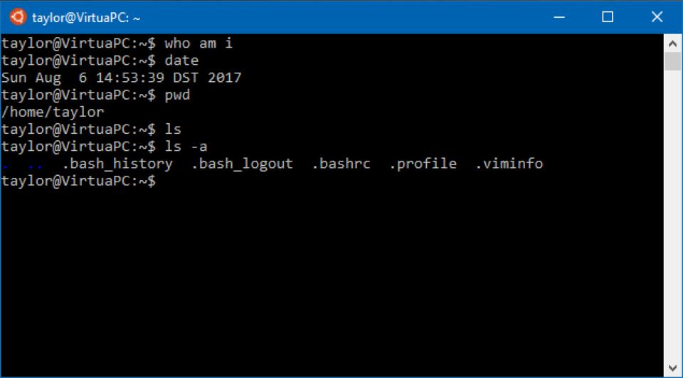 It's interesting to note that some standard Linux commands return nothing—like who am i—but most of them work fine, and there even are dot files in my newly created home directory /home/taylor.