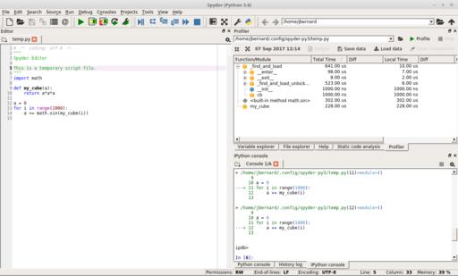 Once you have code that actually works, the next step is to check that code's performance. Spyder includes a front end that gives you access to the profiler included in the standard Python library. Start it by clicking the Run→Profile menu item or by pressing F10. Once it finishes, a new pane will appear in the same upper left-hand location.