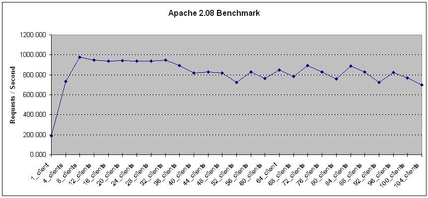 Apache 2.08 was able to respond to an average of 817 requests per second, servicing up to 104 concurrent clients. One important factor is that this server node is diskless and Apache was serving the documents from an NFS partition (which presented some limitations). In other tests, we noticed much better performance (more requests/second) when Apache was servicing documents sitting on the server disk itself.