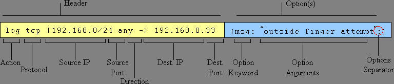 Snort rules consist of two logical parts: the rule header and options. Snort rules must be specified on a single line. Additionally, Snort rules must contain IP addresses, as a hostname lookup is not performed. Figure 2 shows the Snort rule header and options details.