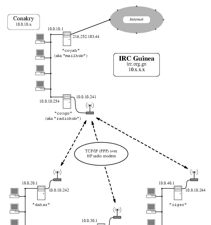 Given these capabilities and limitations of HF, our design strategy for the project uses radio modems in a topology among field offices, as shown in the reference network of Figure 1. In Conakry we have a full-time internet gateway on the host coyah. The radio modem on the host congo serves as the dial-in hub for each of the three field offices. We establish periodic PPP links between the field and Conakry and use our choice of carefully selected client-server protocols over TCP/IP. Although we might have implemented e-mail to the field using UUCP, our TCP/IP system is easier to configure and integrate with the existing network and e-mail system. This setup is also readily converted to use faster telecommunications linkups, such as through landlines or satellites. If and when these become available in the field (and as the budget may support them), the IRC network is ready to simply plug in.