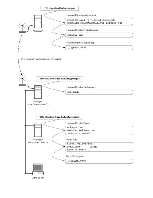 Bounding wirelessly out of Kissi, following rainbows and hot harmattans, the message gracefully traverses the wilds and dangers of earthly terrain to arrive safely in Conakry on the radiohub congo. And here it won't linger. When qmail doesn't find any matching entry in the locals control file, it immediately queues the message for remote delivery. The entry in the smtproutes control file then has the wildcard effect of relaying the messages destined for any domain back to the mailhub server. This configuration purposely segregates the radiohub host as a server only for HF links, while using the mailhub host for all other e-mail services and administration.