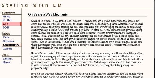 Several good reference books have been written that can help you learn how to design web pages with CSS. However, being able to look up CSS properties and knowing how to apply them to make great-looking web pages is a very different matter. The difficulty lies in that CSS, in a sense, is a kind of artistic tool for web design. As such, acquiring skills in using CSS requires experimentation and, to make the process easier, the guidance of someone who is already talented in its use. To that end, Eric Meyer, who is also an Invited Expert of the Web Consortium's (www.w3.org) CSS working group, has written a new book in which he demonstrates how to design web pages with CSS. The book is called, Eric Meyer on CSS: Mastering the Language of Web Design. Before reviewing Meyer's new book, though, for those who are unfamiliar with CSS, let me explain it a bit and give a few examples. If you already know the basics of CSS, then skip over this next section.
