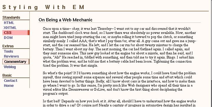Playing along doesn't work well for me, however. I must confess that I'm not disciplined enough for sample exercises. I need real-life situations from which to learn. So, when I read through Meyer's book, I closely studied the style rules and the illustrations in the book. When I hit on something that inspired—which was often—I dropped the book and ran over to my computer and modified one of my web sites to include what I learned. Sometimes my changes didn't work like I thought they would, and I had to go back and reread the particular section that inspired me. This usually involved comparing my surrounding HTML and my style sheet to the project in the book. This is how I learn best.
