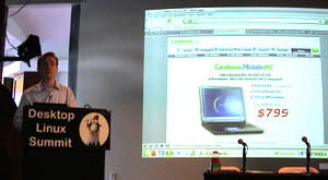 Now, here I am, writing from the floor of the Desktop Linux Summit in San Diego, where Michael Robertson, the founder and CEO of the Summit's local host company, Lindows, has done the same for a much smaller audience (several hundred vs. several thousand) but potentially a much larger market. At the top of his list of announcements is an item that drew a gasp from the audience: a 2.9 pound, $799 Linux laptop, the Lindows MobilePC.