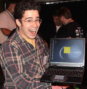 “This thing kicks ass!”, said Chris Pirillo of Lockergnome and TechTV, (that's him in the picture, with the laptop), before he moderated the panel that featured Debian project leader Bdale Garbee. Garbee gave me a more cautious response (his day job is with HP): “Pre-loading Linux on a laptop is always a good idea.” (LindowsOS is based on Debian.)