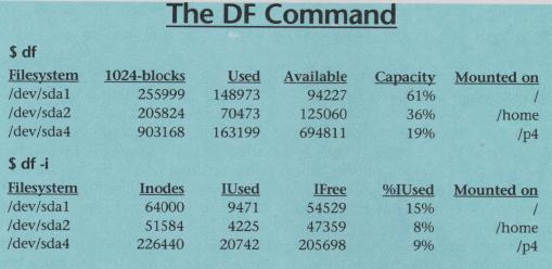 The first column show the name of the disk partition as it appears in the /dev directory. Subsequent columns show total space, blocks allocated and blocks available. The capacity column indicates the amount used as a percentage of total file system capacity.