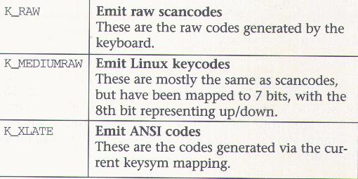 KDSKBMODE sets the translation mode on the keyboard. The options are: