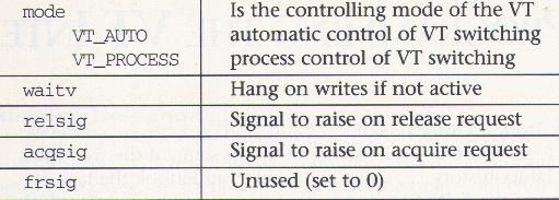 VT_SETMODE sets the control mode of the VT according to the structure: