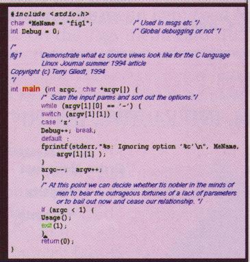 Sometimes just having the editor format the source helps to understand the code. The first time I used ez on my C source, I immediately noticed that some code was shown as comments. “Ha! A bug in ez”, I thought. Well, there was a bug, but not in ez. I discovered I had missed an ending comment delimiter in a program that I thought was working. I actually had 10 lines of code commented out. That was enough to convince me of the value of views in ez.