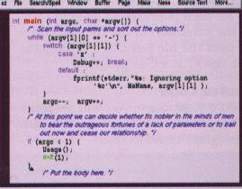 ez will also attempt to help as you enter text by automatically indenting your source lines as you enter them. You do not need to enter a tab to indent, since ez will do this for you automatically. Unlike other aspects of the view, this does modify the source since it inserts tabs to align the text. You can also ask ez to reformat your source at any time. Simply select the area you want to reformat (i.e., so it is shown in reverse-video) and select the menu item Format line/region on the Source Text menu card. You can see the result of this action on our original source program in Figure 4. One convenient feature is that when you enter a trailing delimiter (like a “}”), ez will reverse-video the region to the matching delimiter (“{”). If you press tab at this point, ez will reformat the selected region, saving you the need to later re-select the area with the mouse.