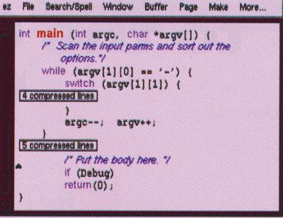 ez is not a complete source browser in the sense of some commercial applications, but rather it provides a set of functions to help you to navigate through your source. Sometimes you don't want to see some parts of your program. Highlight that part of your program with the mouse and select Compress region on the Source Text menu card and you will see something like that shown in Figure 7. If you click in the “compressed lines” box, the code will be shown again. Selecting Decompress all on the Source Text menu card will expand all compressed source areas.