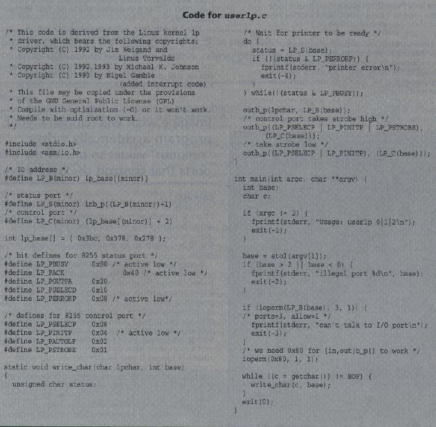 The program userlp.c (see sidebar) needs to be compiled with optimization fumed on and run as root (or setuid root) to work. It takes a file from the standard input and prints it to the printer specified on the command line: O, 1, or 2, corresponding to lpO, lpi, and lp2, respectively.