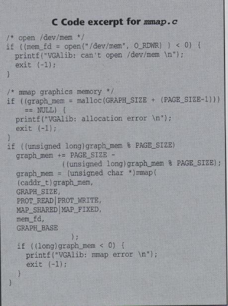 Other devices may need to be accessed at some place in physical memory. The first 3GB of physical memory (if you have more memory than that and don't know how to access the 4th gigabyte, you don't have my sympathy...) can be accessed through /dev/mem. The sidebar (at left on page 20) gives a rough version of the mmap() code from svgalib, which, like XFree86, is a user-space device driver for video cards: