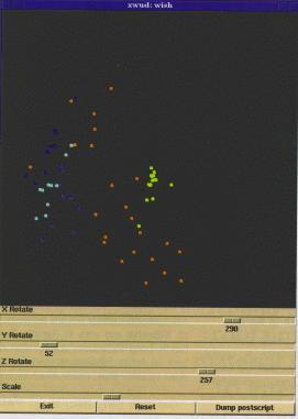 This program reads in a datafile consisting of 3D coordinates, one per point. Each point is also assigned a “type”, which is an integer from 0 to 6. Each point is given a simple 3D-to-2D transformation and plotted with a different color, based on the type. A wish canvas widget is used to do the plotting; wish provides scrollbars to allow you to rotate and scale the dataset. Figure 1 (above) shows what the program looks like on a sample dataset of about 70 points.