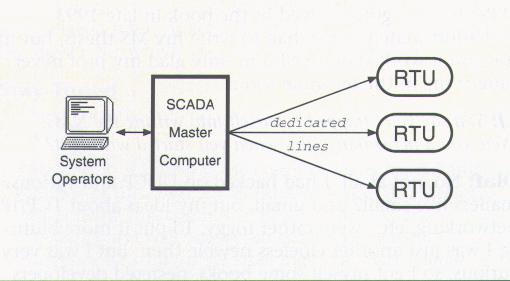 At Virginia Power, the standard medium of communication between RTUs and SCADA master computers is the dedicated serial line, often leased from the local phone company. Several RTUs can be multi-dropped off a single dedicated line (up to 16, a limitation imposed by our currently-used SCADA protocol), but geographical limitations tend to prevent as much sharing of dedicated lines as might be desirable. At the risk of over-simplifying, we can imagine one dedicated line per RTU, giving us a traditional SCADA system something like that shown in Figure 1 (see below).