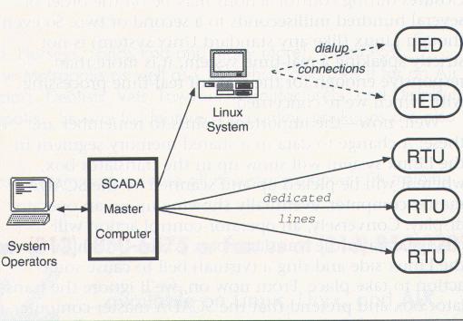 The dialing subsystem has no set limit on the number of phone lines it can handle. If some means could be found to move data back and forth between the SCADA master computers and the Linux systems, a more ideal SCADA system could be constructed, as shown in Figure 3 (see below). This would provide the system operators with a unified overview of their system—all information would be present in the SCADA master computer. Some of it would be retrieved via traditional means (dedicated lines) and the rest would be obtained via dialup connections through the Linux systems.