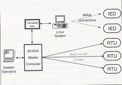 With regard to the first item, we are lucky enough to have available an RTU platform for which our group develops field-resident applications, such as closed-loop feedback controls and protocol translators for IEDs. This platform, obviously, contains all of the requisite firmware and hardware for talking to our SCADA master computers and is fully programmable (in C, thank goodness). Stripped of all unnecessary peripheral hardware and loaded with a simple byte-oriented protocol to talk to our Linux systems over a null modem cable, this programmable RTU functions quite handily as a translator box: status and analog data can be delivered from dialup devices to the SCADA computer, and control requests can be delivered from the SCADA computer to the Linux system for appropriate action. Of course, all the SCADA computer knows is that it is scanning another RTU. The result is a slightly tempered ideal system as shown in Figure 4.