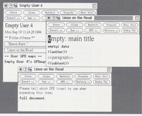 Now we'll start writing our upcoming article for Linux Journal about “Linux on the Road”. We prefer to store the article in our home directory (the “Empty User 4” window). First, move the cursor to the “Simon Says.” line in “Empty User 4” window. Then, insert a new item in folder view by giving the command meta-l meta-i (insert closest plural), which will create a sibling of the current item. (See “The xlincks User” manual or the next part of this series for more information.)