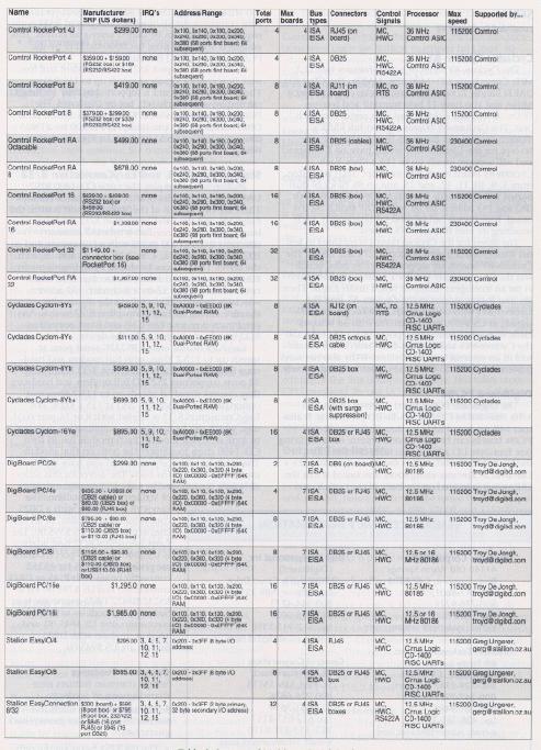 In the 1.1 Linux development kernel, Ted Ts'o (the maintainer of the serial driver and the tty driver) rewrote the generic tty driver to allow support for many kinds of serial devices, improving the serial drivers in the process. Since then, several drivers for intelligent multiport boards have been written, and more are being developed. In this issue, I'll be reviewing 8-port intelligent serial boards supplied by four manufacturers: Comtrol, Cyclades, Digi International, and Stallion Technologies. For vendor contact information, please see the Vendor Contact Information. Now let's look at each board in detail.