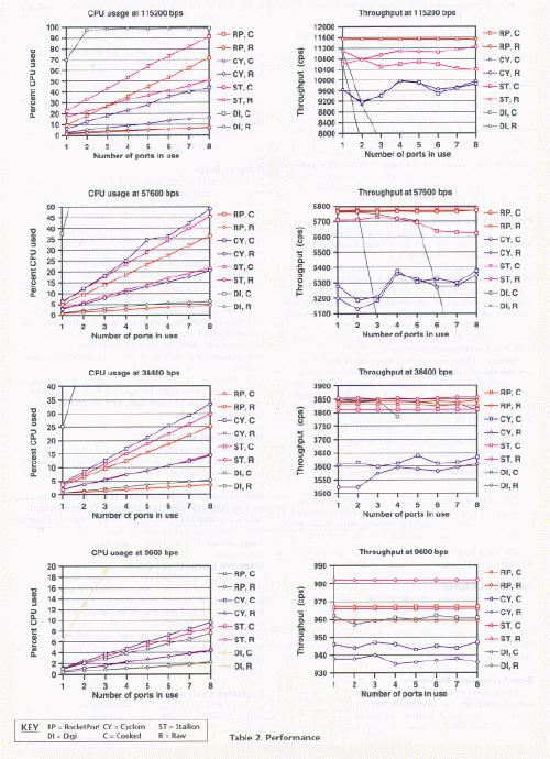 Under ideal conditions, the actual character per second (CPS) output will be the serial port speed divided by ten. Each character transmitted is 8 bits plus a start and stop bit, hence we device the speed by ten. Output tests were done at 9600, 38400, 57600 and 115200 bps, each in both raw and cooked mode. The raw output data was compiled into graphs for each speed, showing the CPS throughput on one to 8 ports and the CPU usage on one to 8 ports (see page 50).