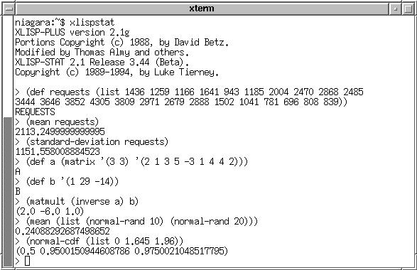 Assuming that you have installed Lisp-Stat successfully, just type xlispstat to invoke the program. To quit the program, just type (exit). Figure 1 shows a simple session. Case does not matter and the > you see in the figure is Lisp-Stat's prompt. The data I have used is the number of requests a WWW server honored during each of the 24 hours in a day. The def macro binds a variable name requests to the list of values.