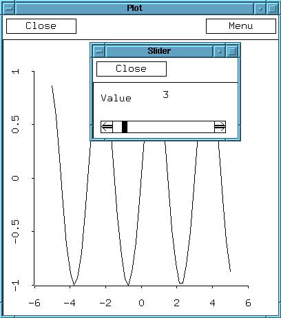 (setf n 1) (defun f (x) (sin (/ (* 2 pi x) n))) (def sine-plot (plot-function #'f -5 5)) (defun change-n (x) (setf n x) (send sine-plot :clear :draw nil) (send sine-plot :add-function #'f -5 5)) (sequence-slider-dialog (iseq 1 20) :action #'change-n)