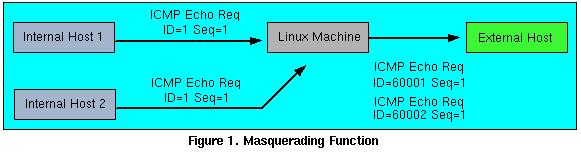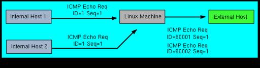 Actually, ping could work. ICMP echo request/echo reply messages can be masqueraded for. The key is the identifier field in the ICMP message. The problem is matching replies that come back from the external networks to the originator. The masquerading would function as shown in Figure 1.