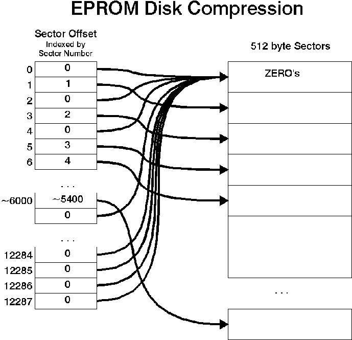 When deciding how to implement the EPROM device driver, the first idea was to create an image of a disk in the EPROM. This would provide a RAM disk of the same size as the EPROM, 3.5MB in this case (the DOS portion of the SSD takes 1/2 MB). Instead, to allow a larger RAM disk, a compressed disk image is used. The compression used is simple—any sectors which are identical are only stored once. The primary advantage this gives is blank areas of the disk image don't need to take up EPROM space. Listing 1 shows the SSD disk compression used.