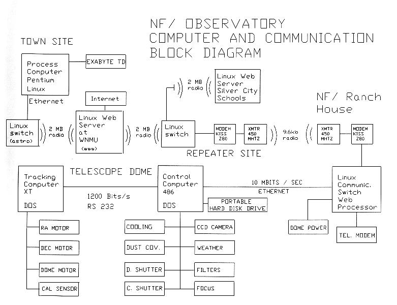 This node is located at the NF/ ranch and is the one that uses the antenna shown in Figure 1. When we built the telescope in 1986 there was no telephone service to the ranch. In fact, there wasn't even commercial power to the ranch until 1984! The three media types used here are ham radio, coaxial Ethernet and telephone modem. Ham radio has been in use for 10 years and predates Linux. The radio link receives information used to program the observing list for the telescope. It also transmits the pictures and telemetry from the telescope back to the data reduction computer and the Internet connection in Silver City.